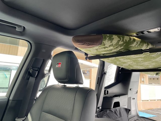 サーフボードのロッカー(反り)がちょうど天井に添うようにすっきり積載できます。
