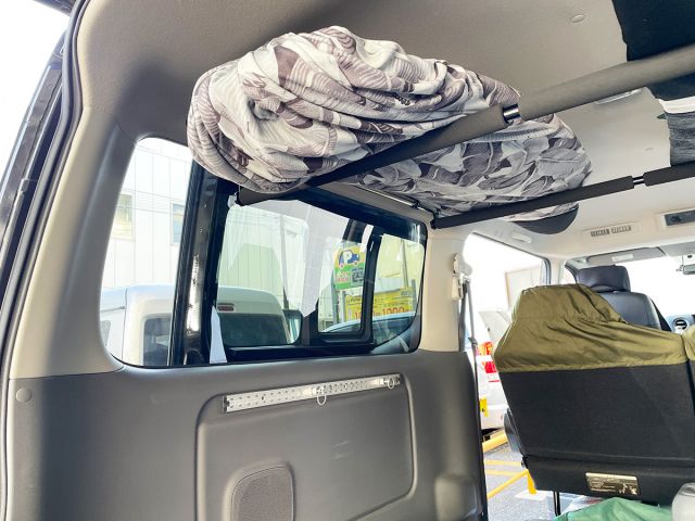 ●お仕事にもアウトドアにも、ここに市販のクリップミニ扇風機やライト、ランタン、メッシュネットなどを取り付けることもできます。 車内泊には必須、マストアイテムです。