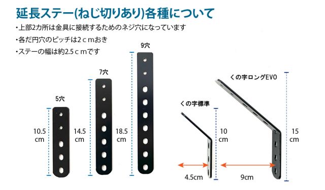 延長ステーは5穴(約10.5cm)・7穴(約14.5cm)・9穴(約18.5cm)からお選びいただけます。