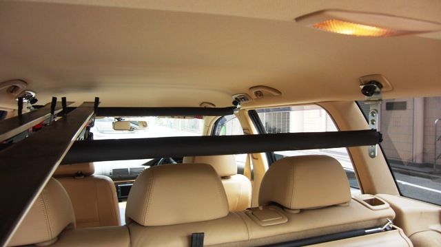 【コゾウキット】手すり固定金具式標準タイプ 取付け事例 取り付け車種ですが、アルファロメオ156スポーツワゴンになります。 天井のハンドルは4つ付いているのですが、幅が90cm程度しか無いため、 ちょっと取り付けに工夫を要するかもしれません。 ボードはファンですが、仮で棒を通して載せてみたので、問題ないと思います。 検索はヤフオクでボードを探していて、偶然見つけました。 以前からボードの積み込みには苦労していて、助手席倒して 2人で前後に座ったりしていましたが、これで解決できれば 非常に助かります。 昨日ご連絡しましたSです。 遅くなりましたが、本日車の写真を撮影しました。 (アルファ156 スポーツワゴン) ファイル1.は90cmの緑の棒を比較として、置いています。 ファイル2.はグリップ部です。普段は上に閉じているタイプです。 撮影時にきちんと計ってみると、天井は幅が90cm以上 あるものの、ハンドグリップ間では90cmを少し切って いました。 先日のメールのように、もし可能であれば90cm以下になるようにして頂けますと助かります。 よろしくお願いいたします。 →この後バーの長さ最短70cmになる様改良いたしました。 0020【コゾウキット手すり固定金具式標準タイプ |