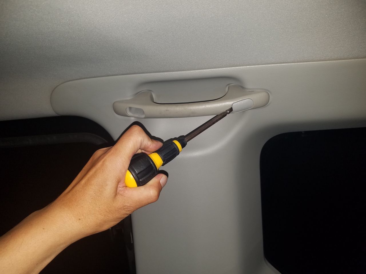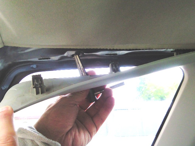 荷室に穴がない場合の取り付け手順(【コゾウキット】 手すり&ターンナットネジ留め(蝶番ステー)タイプ) (2)この写真にはありませんが3列目荷室窓後方下部にもネジが一個付いてるのでそれも外します。 (3)プラスティック車壁カバーを指で広げます。 |