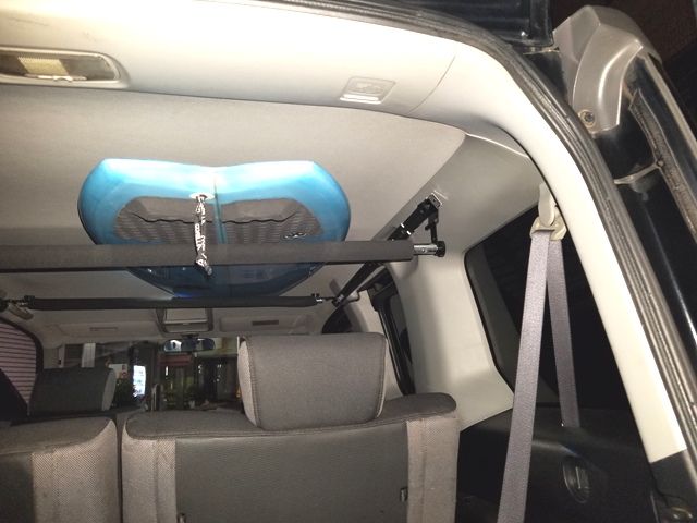 運転手席上と2列目シート上左側に手すりのない場合の取付事例 (【コゾウキット】固定金具式斜めがけタイプ) こんばんは。北海道のYです。本日取り付けてみましたので、写真をお送りいたします。 私の場合、セカンドシートの右側の手すりが無いステップワゴンスパーダの上に、 オプションでフロントガラスの上部に収納の大型のボックスをつけているために、 取り付けには最悪の条件だったと思います。 しかしながら、一番良く使う9.0のロングは、フィンを取り付けたままでも入りました。 ボックスが無ければ、もっと長い板でも大丈夫でしょうね。 助手席の手すりに金具がぶら下がると乗る人が頭をぶつけるのではないかと心配でしたが、 よほど頑張らないと頭をぶつけることはできませんでした。 あと、私はスキーもするので、スキーの積み込みも実験してみました。 たぶん大丈夫だと思うのですが、スキーキャリアの部品の一部を使って固定したらどうかな、と思って いろいろ実験しています。頑張ってよい方法を見つけようと思っています。 |